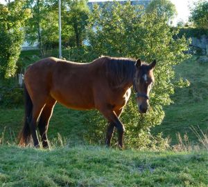 Fredelige sauer som beitet på heimagarden. Litt seinere gikk vi over et gårdstun og der var det en frittgående hest! Jeg ble litt matt, men han var visst mer interessert i gress enn meg!