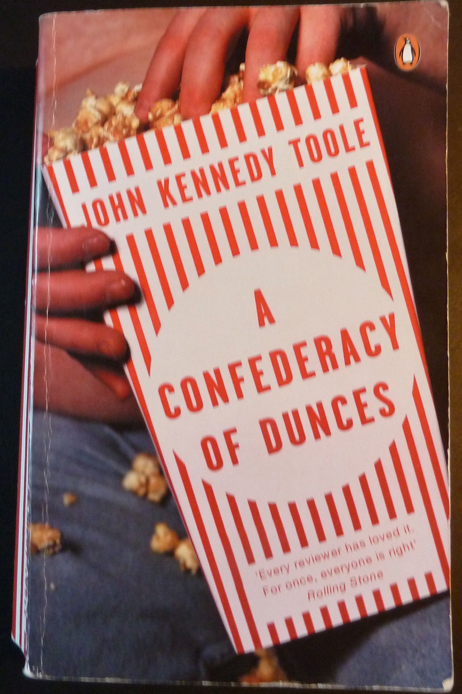A Confederacy of Dunces eller Tåpenes sammensvergelse av John Kennedy Toole var sommeren store leseøvelse. Det ble en øvelse i utholdenhet, forundring over at det går an å skrive så mye om raping, spising og andre kroppslige funksjoner, samt skrudde ideer, at jeg den siste delen av boka leste videre av ren nysgjerrighet hvordan dette ville ende. Jeg leste boka på engelsk, dermed tok lesingen lengre tid for her var det mye dialekt, men da jeg begynte å tenke på dialogen som en hørbar samtale så gikk alt så meget bedre. Jeg har lest andre bloggere som har lest boka på norsk og det er mulig at selv om jeg brukte lang tid på lesingen, så var kanskje engelsk et bedre valg. Dessverre leste jeg forordet, det er i grunnen alltid en dårlig idé for Mr. Percy legger sterke føringer for lesingen og det er hemmende. Jeg tok meg stadig i å lure på hvor mye som var biografisk i denne romanen, for slik jeg leste bokens første deler har hovedpersonen Ignatius J. Reilly og JKT sterke likhetstrekk og da jeg googlet på JKT i dag tenkte jeg at sånn kunne faktisk Ignatius ha sett ut og – på en veldig god dag. Ignatuis bor i New Orleans med sin mor som er forfyllet. Han har undervist på et universitet, men ble sparket derifra for han rettet ikke oppgaver og utførte minimalt med arbeid. Han vil helst ligge på sengen, spise og tenke på fordøyelsen sin. Vi treffer ham og moren i det første oppløpet der en forkledd politimann prøver å fengsle ham for ikke å kunne identifisere seg. Ignatius er særdeles velartikulert og driver enklere hoder til fortvilelse og raseri. Moren og Igntius klarer å komme seg vekk derifra og ender i baren The Night of Joy der de drikker – øl til mor og Dr. Nut til Ignatius. Også på denne baren blir det oppstandelse og med en full mor bak rattet klarer de to å vikle seg inn i vraking av både bil og hus. Dette fører med seg at moren får en bot som må betales og hun på sin side krever at Ignatius må skaffe seg en jobb slik at han kan hjelpe henne med å betale. Og herfra ruller historien om Levy Pants, pølsevognen og alle de utrolig personene han møter og ikke minst hvordan han prøver å implementere sine skrudde ideer. Er dette morsomt? Tja, hvis jeg hadde greid å finne et fjon av et sympatisk trekk hos Ignatius, men han er en egosentrisk type som bare tenker på seg selv, sitt tarmsystem og en sjelden gang på Myrna som han studerte sammen med. Nå er det også slik at forfatteren ikke har særlig sympati med noen av figurene sine, det måtte i tilfelle være Mr. Levy som lever i skyggen av sin far som startet Levy Pants og under stadige anklager fra sin kone. Skriver Toole godt? Ja, det gjør han. Denne boka omtales som en satire og lese den slik så er det noen store øyeblikk her: f.eks. når Ignatius finner på et nytt arkiveringssystem hos Levy Pants, (som bibliotekar fikk jeg nesten åndenød). Jeg er overbevist om at denne boka vil jeg like mye bedre når det har gått noen uker og jeg har fått det hele på litt avstand. Det tar på å lese om en diger overvektig, slafsende fyr med grønn jaktlue med klaffer , tweedbukser og tykk, rutete flanellskjorte. Prøv selv om du vil!