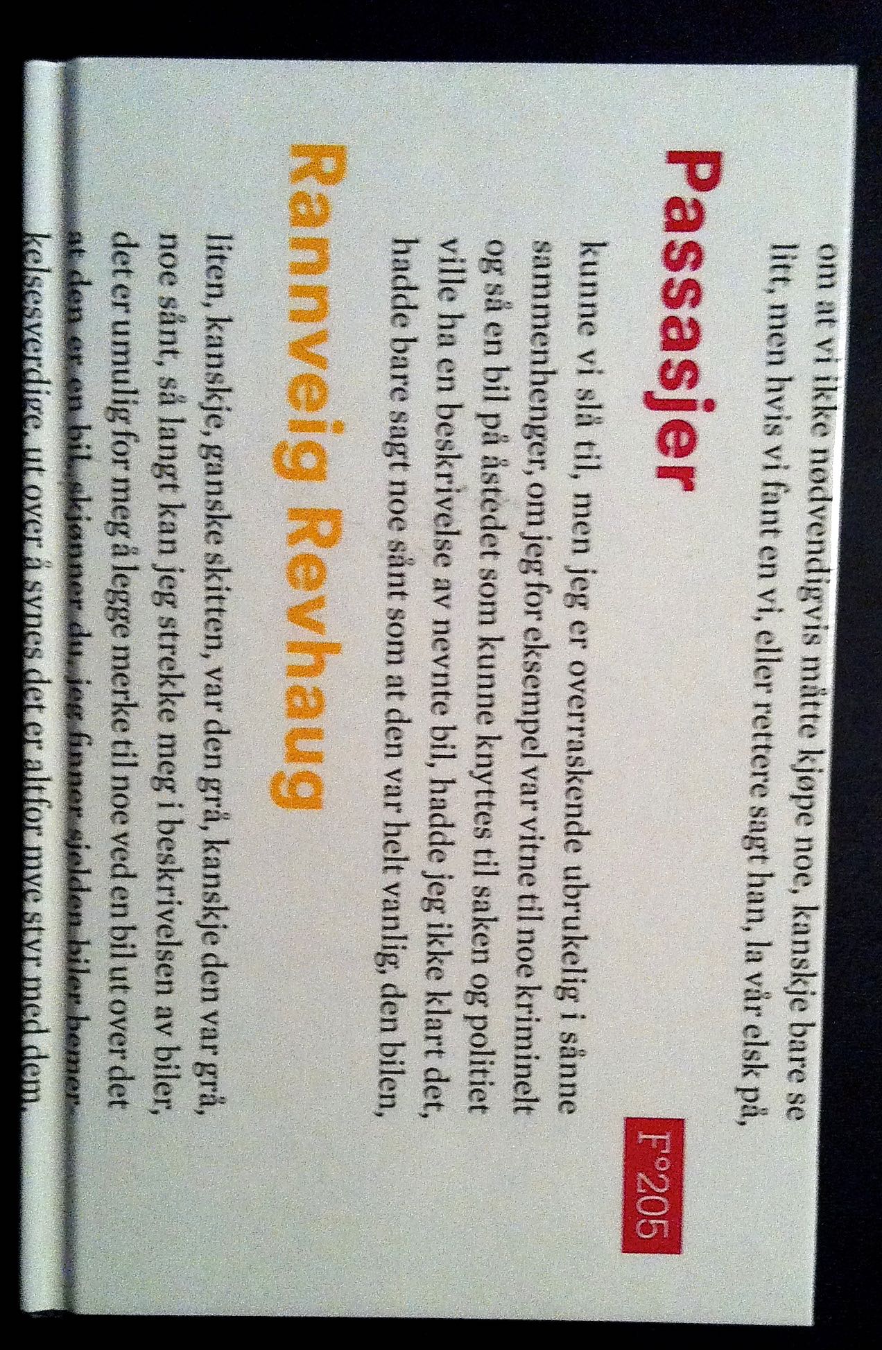Jobb-utfordring: les en k-fond bok du tror ingen andre kommer til å lese! OK! Biblioteka i Nordhordland har et bokpresentasjonsmøte i desember hvert år. Da utfordrer vi hverandre til å presentere bøker som andre velger for oss eller vi blir utfordra til å velge en bok «utenfor allfarvei» så og si. Dette gjør vi for å bli kjent med litteratur som ikke er blandt bestselgerne, på lånetoppen eller på andre måter lett å pushe på folk. Mitt valg var Rannveig Revhaug sin bok Passasjer, utgitt på Flamme forlag, 2014. Jeg var ganske sikker på at jeg skulle slite meg gjennom 50 sider, for så å gi opp og legge boka fra meg, men neida, jeg leste alle de 143 sidene. Hvorfor? Dette er en samling tekster som beskriver en enslig kvinne i tretti årene med en spesiell evne til å registrere og skrive ned de daglige trivialitetene som vi nesten ikke legger merke til. Jeg har sjekket nettsiden til forlaget og der finner jeg noen av tekstene som små «reisebrev». Noen av tekstene er uten punktum, mens andre flommer over av dem noe som gjør leseropplevelsen ganske stakkato, men også rytmisk og suggererende. Forfatteren skriver ned telefonsamtaler med det offentlige, værmelding, reiser med avising av flyet, bilturer der hesjer, høyballer, postkasser, låver, hus i skråninga fyker forbi og det gjentar seg og gjentar seg – helt til de faktisk er framme. Det er annerledes måte å fortelle om en tilværelse på, sett innefra på et vis. Boka krever at du gidder å lese de samme ordene mange ganger, nesten identiske setninger og rare vrangforestillinger – som innimellom er nesten hysterisk morsomme. Jeg hadde ikke trodd at jeg gadd, men det gjorde jeg! Det er faktisk en bok jeg er glad for at jeg leste. Rar, men inderlig på sitt vis.