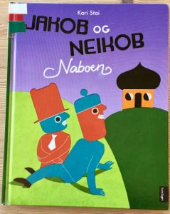 Kari Stai har gjennom sitt unike formspråk funnet et konsept som fungerer veldig godt for høytlesing i både store og små grupper. Dette er fjerde boka om Jakob og Neikob. Denne gangen får de naboer og det har de ikke hatt før. Neikob bygger et gjerde, mens Jakob bygger en bro. Jakob er på samme måte som Neikob redd for tyver og monstre så de bygger en vegg der døra var. Da kommer de ikke selv inn og må sove ute. De tenner et bål, men så må de på do. De kler seg ut som natten og går inn til naboen for å gå på do. Naboen kommer springene fordi det brenner i nabohuset. Brannen blir raskt slukket av branndamen Eldrid og Jakob spør om hun vil være med å lage et nabolag. Det vil hun og dagen etter bygger Jakob og Neikob flere hus slik at de kan få flere naboen.